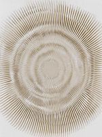 Abstracte, bijna hypnotiserende structuur die doet denken aan een organisch patroon — als een fossiele afdruk, de nerven van een paddenstoel, of een zonnestraal gevangen in beweging. Het beeld is opgebouwd uit fijne ribbels die in concentrische cirkels uit het midden stralen. De tinten zijn subtiel en aards, met een nadruk op beige en…