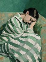 Ingetogen en intiem moment: een jonge vrouw rust met gesloten ogen op een bank, haar hoofd zachtjes leunend op haar handen. Ze draagt een kamerjas met brede wit-groene strepen, die in harmonieuze penseelstreken zijn weergegeven. De omgeving — een stoffige, groentintige muur en een gedempte bank — versterkt de serene, bijna melancholische sfeer van het tafereel.
