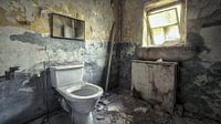 Dit sombere, sfeervolle kunstwerk toont een oude, vervallen badkamer waarvan de muren getekend zijn door afbladderende verf. Een gebroken ruit laat zwak, natuurlijk licht door en verlicht het verval en de sporen van de tijd. De erosie van de oude structuur en de melancholische stemming van de kamer vertellen een verhaal van verval en vergankelijkheid. Het contrast tussen de zachte lichtinval en de desolate staat van de kamer creëert een diep, emotioneel effect dat de kijker herinnert aan de schoonheid en droefheid van vergankelijkheid.