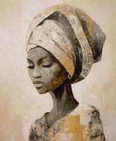 Een ingetogen maar krachtig portret van een Afrikaanse vrouw, gehuld in een traditionele hoofddoek met gouden accenten. De verfstreken zijn ruw en expressief, maar stralen zachtheid en waardigheid uit, alsof haar stilte een verhaal vertelt over identiteit, cultuur en innerlijke kracht. Dit kunstwerk is geïnspireerd op klassieke schildertechnieken en Afrikaanse elegantie.