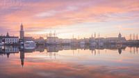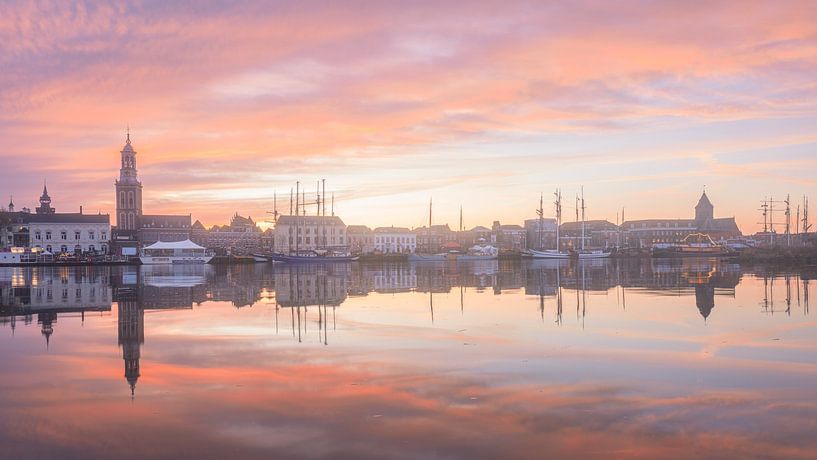 In dit verstilde havenzicht vloeien stad kampen en IJssel samen in zachte tinten van rood, roze, lila en blauw. De skyline weerspiegeld zich bijna naadloos in het kalme water, waardoor werkelijkheid en droom in elkaar overlopen.