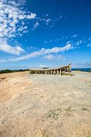 Bankje gebogen door de wind op het observatiedek bij de vuurtoren aan de Hiddensee, Rügen, Mecklenburg Vorpommern, Oostzee
