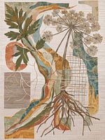 Dit is een botanische collage (mixed media art) met o.a. een Reuze Berenklauw (Schermbloem) en verschillende linnen weefsel structuren.