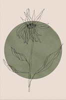 Lijnkunst bloem in zwart op saliegroen en lichtbeige achtergrond. Bloemen semi abstracte minimalistische kunst met een beetje retro vibes. Perfect voor een woonkamer, slaapkamer, wachtkamer, werkkamer, tuin of hal. Bohemian, Zen, Scandinavisch, Basic, New Rural, Romantic woonstijl.