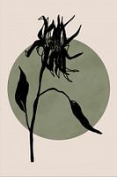 Lijnkunst bloem in zwart op saliegroen en lichtbeige achtergrond. Bloemen semi abstracte minimalistische kunst met een beetje retro vibes. Perfect voor een woonkamer, slaapkamer, wachtkamer, werkkamer, tuin of hal. Bohemian, Zen, Scandinavisch, Basic, New Rural, Romantic woonstijl.