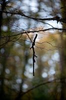Takje dat op wonderlijke wijze door een aantal dunnere takjes is opgevangen in haar val. Herfstbos.