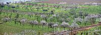 Donaudal in het voorjaar met bloeiende fruitbomen en spoorlijnen, Wachau, Neder-Oostenrijk, Niederösterreich