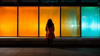 Wachten op een bus die maar niet lijkt te komen. Ze kijkt vol verwachting naar de grote stad achter de gekleurde schermen van bescherming.