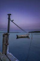 Kijken op de steiger met het zicht op de zee , de boot , en het blauwe uurtje.
