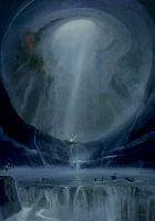 In dit sombere schilderij, gedomineerd door diepe blauwe en bruine tinten, wordt de blik van de kijker naar boven getrokken. Daar dringt een lichtstraal door een bovenste opening de grot of schacht binnen, waardoor een mysterieuze sfeer ontstaat. Een spiraalvormige structuur opent zich naar boven en dient als leidraad voor het…