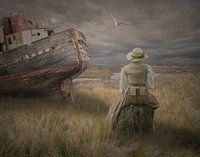 Vrouw wacht op..... Een composite van zes verschillende foto's met een schilderij effect. De gebruikte foto's zijn door mijzelf genomen. Het scheepswrak komt uit Schotland, het graslandschap en de vogel uit Noorwegen en de vrouw en de lucht zijn van foto's genomen in de VS. Daarnaast is er een texture achtergrond gebuikt voor een schilderachtig effect.