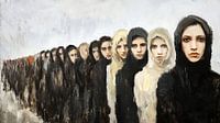 Een diverse menigte wacht in een lange rij onder een grijze, bewolkte hemel. De gezichten van de wachtenden weerspiegelen een mengeling van verwachting en onzekerheid, waardoor de spanning van het moment wordt vastgelegd.