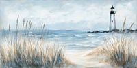 Dit schilderij toont een uitzicht vanaf een duinpad richting de zee, met een vuurtoren rechts in het beeld die op een rotspartij staat. De zee beweegt in ritmische golven richting het strand, terwijl hoog helmgras de voorgrond vult. De compositie geeft het gevoel alsof de toeschouwer zelf net bovenaan het pad staat, tussen het gras door…