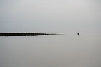 Aan de zuidwestelijke rand van Denemarken, waar het wad zich uitstrekt onder een stille hemel, rijst een kunstmatige pier van gestapelde stenen op uit het water. In het verlengde ervan staat een reiger – roerloos, als een levend verlengstuk van de pier zelf. Zijn reflectie wiegt zachtjes in het kalme water, een spiegelbeeld van waakzaamheid en stilte.