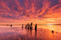 De lucht explodeert met kleuren op deze winterse morgen. Foto gemaakt rond zonsopkomst op het wad bij Moddergat