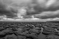 Droogvallende moddereilandjes tijdens het eb in de Waddenzee.