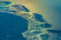 Luchtfoto van een deel van de Waddenzee met Ameland en Terschelling