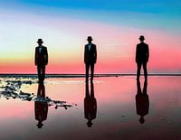 De silhouetten van drie mannen in pakken en hoeden staan voor een indrukwekkende zonsondergang die prachtig wordt weerspiegeld in het water. De lucht verandert van diepblauw naar zachtroze en creëert een surrealistische en droomachtige scène.....Digital art image, ontwerp en compositie door mij, visualisatie met AI