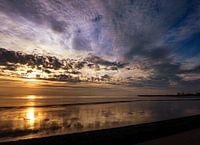 Een lucide avond aan het wad bij Harlingen. De zon gaat onder en de lucht krijgt bonte kleuren. Het water weerspiegelt de zon en de wolken en dan is het donker.