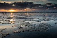 Zonsondergang met een mooie wolkenlucht aan de Waddenzee nabij Koehool, Friesland. Op de voorgrond zeekraal zichtbaar doordat het eb is.