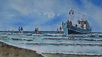 Aquarel met wadlopers. Het wordt weer vloed en stappen weer aan boord voor de terugtocht vaste wal.