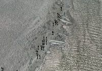 Wadlopers lopen over de droog vallende platen op het wad tussen Holwerd en Ameland tijdens eb.