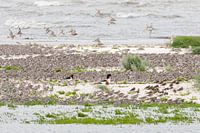Diverse soorten wadvogels rusten op een wadplaat tijdens hoogwater: kanoeten, steenlopers, bonte strandlopers. En een bergeend en een scholekster lopen er als 'vreemde' vogels tussen.
