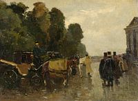 Het is een regenachtige dag op het Malieveld, een groot groen in Den Haag. De koetsiers van de huurwagons wachten in de buurt van het wachthuisje op de passagiers. De koetsiers droegen over het algemeen kleurrijke outfits, wat hen in Amsterdam de bijnaam 'kleine aapjes' opleverde. De felle kleuren zijn hier verborgen onder hun regenkapjes. De Zwart schilderde, net als Breitner, beelden van het moderne stadsleven, maar had de neiging om de voorkeur te geven aan rustige straatscènes.