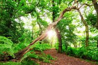 Prachtige opname van het groene Wageningse bos in de zomer met een dode boom diagonaal door het beeld
