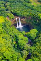 De Wailua waterval ligt op het Hawaiiaanse eiland Kauai. De foto is genomen vanuit een open helicopter en geeft een mooi zicht op al het omringende groen van deze beroemde waterval op het eiland.