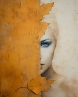Modern en abstract portret met de titel: "Waiting for an Indian summer". Het gezicht van de vrouw gaat voor de helft schuil achter herfstbladeren en een oranje goudkleurige strook.