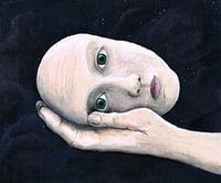 Een acrylverf schilderij van een los, kaal hoofd die in een hand ligt. De hand is in verhouding groter dan het hoofd.