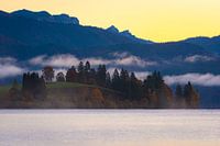 Walchensee met het schiereiland Zwergern, daarachter de Alpen met zachte mist in de zonsopgang