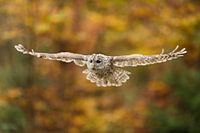 Tawny Owl / Waldkauz (Strix aluco) in flight in front of bright yellow green leaves, autumnal background colors.
