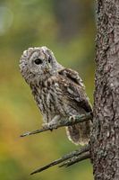 Tawny Owl / Waldkauz ( Strix aluco ) perched on a dry branch of a tree, bright eyes, watching curious, attentively, autumnal background, golden October, Europe.