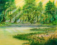 De heldere waterreflecties in het meer geven het schilderij een kalme en vredige sfeer, terwijl de lichtstralen die door het dichte bladerdak van bomen breken een levendige kwaliteit en een bijzonder spel van licht en schaduw aan het tafereel geven.