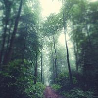 Wanderweg durch Buchenwald an nebligem Sommermorgen