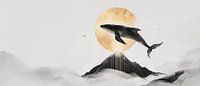 Een majestueuze walvis zweeft door de wolken, terwijl een stralende maan over ruige bergen op de achtergrond schijnt. Dit dromerige tafereel voert je mee naar een wereld van fantasie en rust. Ideaal voor de slaapkamer of een creatief kantoor, het brengt een vleugje inspiratie en sereniteit in elke kamer.