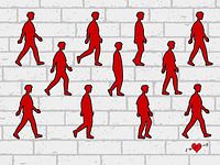 Het digitale kunstwerk getiteld "Walk This Way (reprise)" toont een reeks identieke silhouetten van wandelende figuren, uitgevoerd in felrood met een zwarte omlijning. Deze figuren zijn verspreid over drie horizontale rijen en lijken te wandelen op een achtergrond van lichtgrijze bakstenen. De combinatie van uniformiteit en subtiele variatie in houding roept een gevoel op van ritme, herhaling en beweging – alsof de figuren deel uitmaken van een choreografie of loopcyclus.