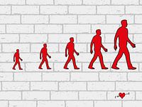 Het digitale kunstwerk "Walk this Way" toont een gestileerde en minimalistische voorstelling van menselijke evolutie of persoonlijke groei. Op een achtergrond van een lichtgrijze bakstenen muur zijn vijf menselijke silhouetten in profiel zichtbaar, elk in rood omlijnd met een zwarte schaduw, lopend van links naar rechts. Wat onmiddellijk opvalt is de geleidelijke toename in grootte van de figuren, wat symbolisch kan staan voor ontwikkeling, volwassenwording of vooruitgang door de tijd.