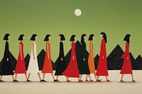 Walk like an Egyptian. Personen in rood zwarte kleding lopen in twee richtingen met op de achtergrond piramides.