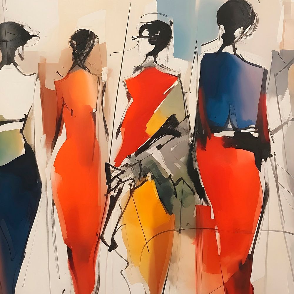 Een abstract aquarel kunstwerk in een expressionistische stijl van een groep vrouwen in modieuze kleding, tegen een abstract stadsgezicht met losse penseelstreken. Het kunstwerk heeft een elegante, stijlvolle en modieuze stijl wat de essentie van urban chic vastlegt, waardoor een visueel aantrekkelijke compositie ontstaat.