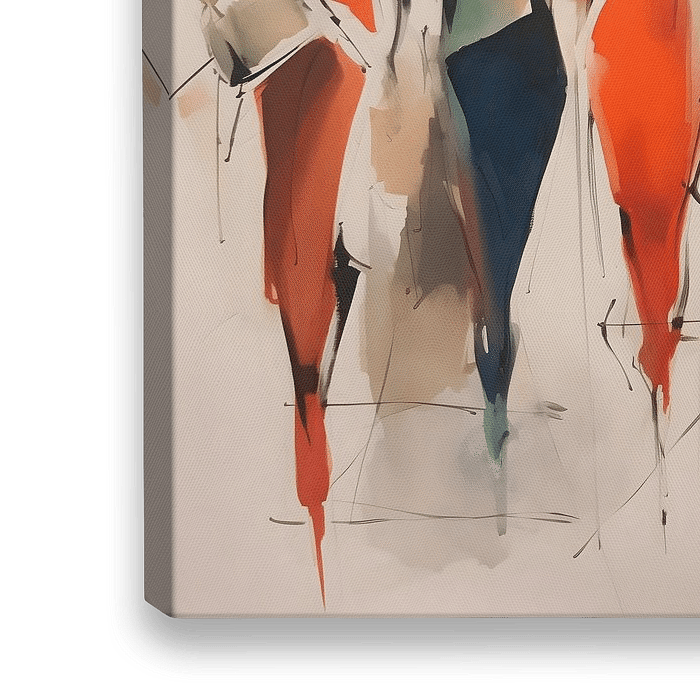 Een abstract aquarel kunstwerk in een expressionistische stijl van een groep vrouwen in modieuze kleding, tegen een abstract stadsgezicht met losse penseelstreken. Het kunstwerk heeft een elegante, stijlvolle en modieuze stijl wat de essentie van urban chic vastlegt, waardoor een visueel aantrekkelijke compositie ontstaat.