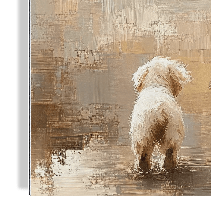 Een kunstwerk van een klein meisje die wandelt met haar hond, waarvan de achtergrond een abstracte beige kleur met een zachte textuur heeft. De schilderstijl kenmerkt zich door ruwe penseelstreken in warme tinten. De compositie benadrukt hun interactie in een vrolijke sfeer.