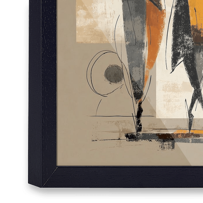 Een abstract kunstwerk van gestileerde figuren met vereenvoudigde menselijke vormen. De achtergrond is minimalistisch met geometrische vormen en subtiele texturen die het ontwerp complementeren, wat een eigentijdse en artistieke sfeer creëert.