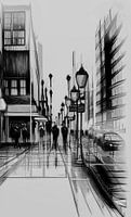 Houtskool illustratie van een straat in Parijs met de iconische lantaarns.