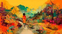 Een levendig, abstract landschap met een vrouw die een wandeling maakt over een kronkelend pad, ze wordt omringd door een rijkelijk gekleurde achtergrond van bergen, bomen en gebladerte die het tafereel domineren. De lucht is heldergeel, wat bijdraagt ​​aan de warme, betoverende sfeer van de omgeving.