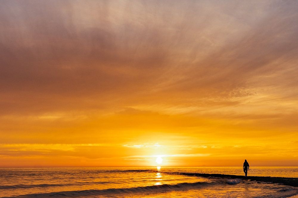 Zonsondergang aan het strand. Een sportvisser probeert zijn geluk aan het eind van de strekdam.