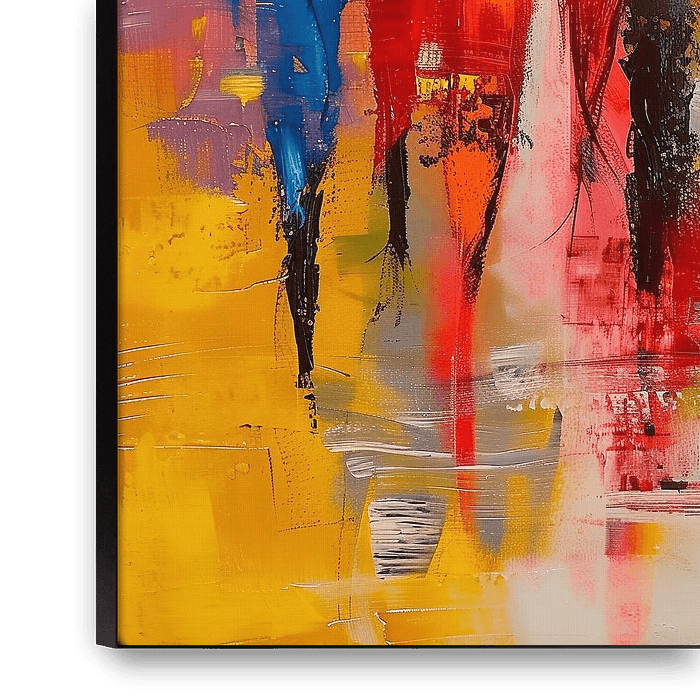 Een abstract kunstwerk van een groep silhouetten die samen lopen. De achtergrond is een levendige en dynamische kleurencombinatie die warmte en energie uitstralen en overgaan in koelere kleuren. Brede, expressieve penseelstreken brengen een ​​gevoel van vloeiendheid en emotie over, de algehele stijl is modern en impressionistisch met de…
