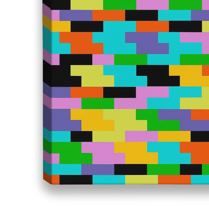 Een kunstwerk met een levendig patroon bestaande uit rechthoekige blokken in verschillende felle kleuren willekeurig overlappende gerangschikt. De compositie creëert een dynamisch en speels visueel effect, met kleuren die scherp met elkaar contrasteren.